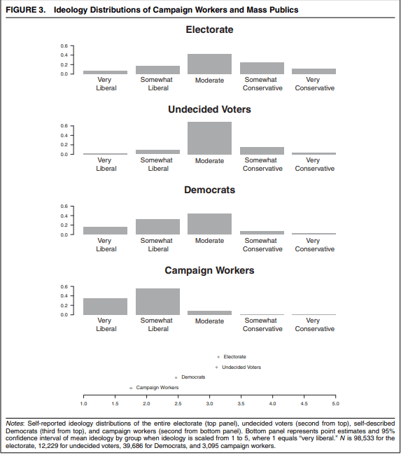 Looking at the ideology of campaign workers juxtaposed with undecided voters in Ohio, one might observe that undecided voters had large proportions in the “moderate“ and “somewhat conservative” categories while most campaign workers were in between the “somewhat liberal” and the “very liberal” categories. Making matters worse (for the candidates), out-of-state campaign workers were even more detached from the point of view of in-state workers, further weakening the effectiveness of canvassing. (Enos & Hersh 17).